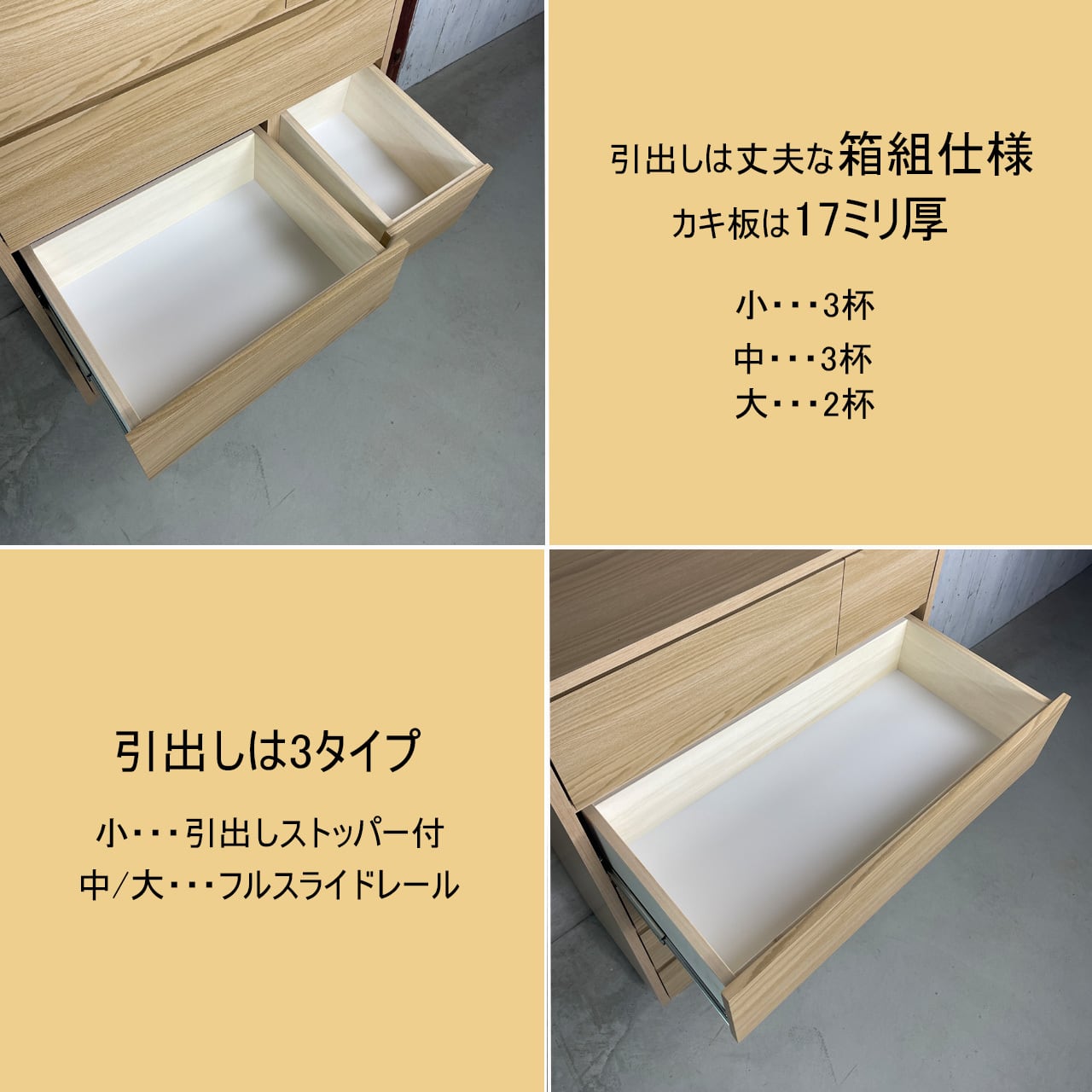 大・中引出にはフルスライドレールを使用。箱組(四方組)・桐材・ダボ組。カキ板17mm 大引出は底板補強サン付きで丈夫な作りです。
