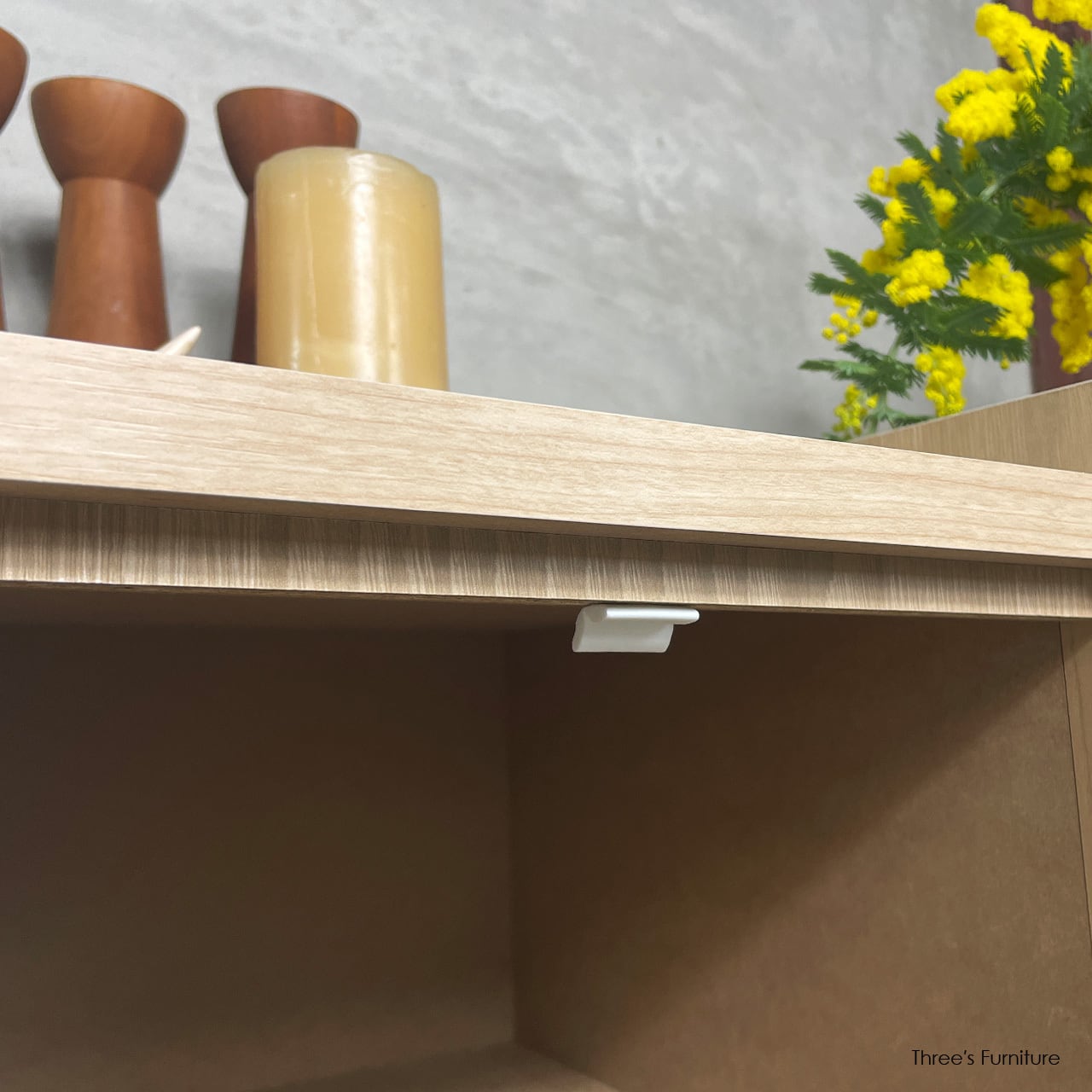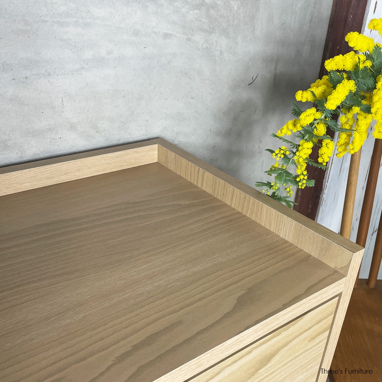 天板の三方に転び止めを備えた、安心感のあるデザインのチェストです。