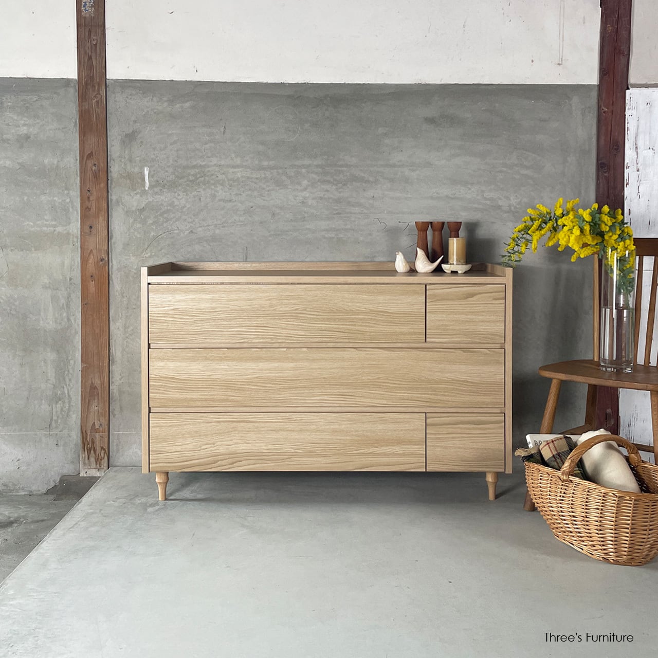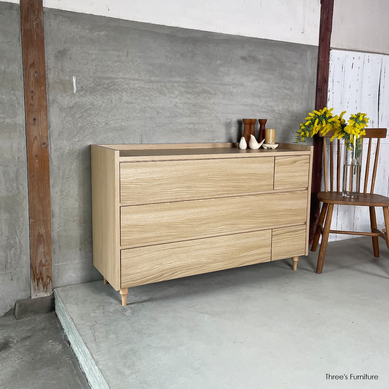 3タイプの引出しを組み合わせることで、シンプルながらも表情のあるデザインになっています。