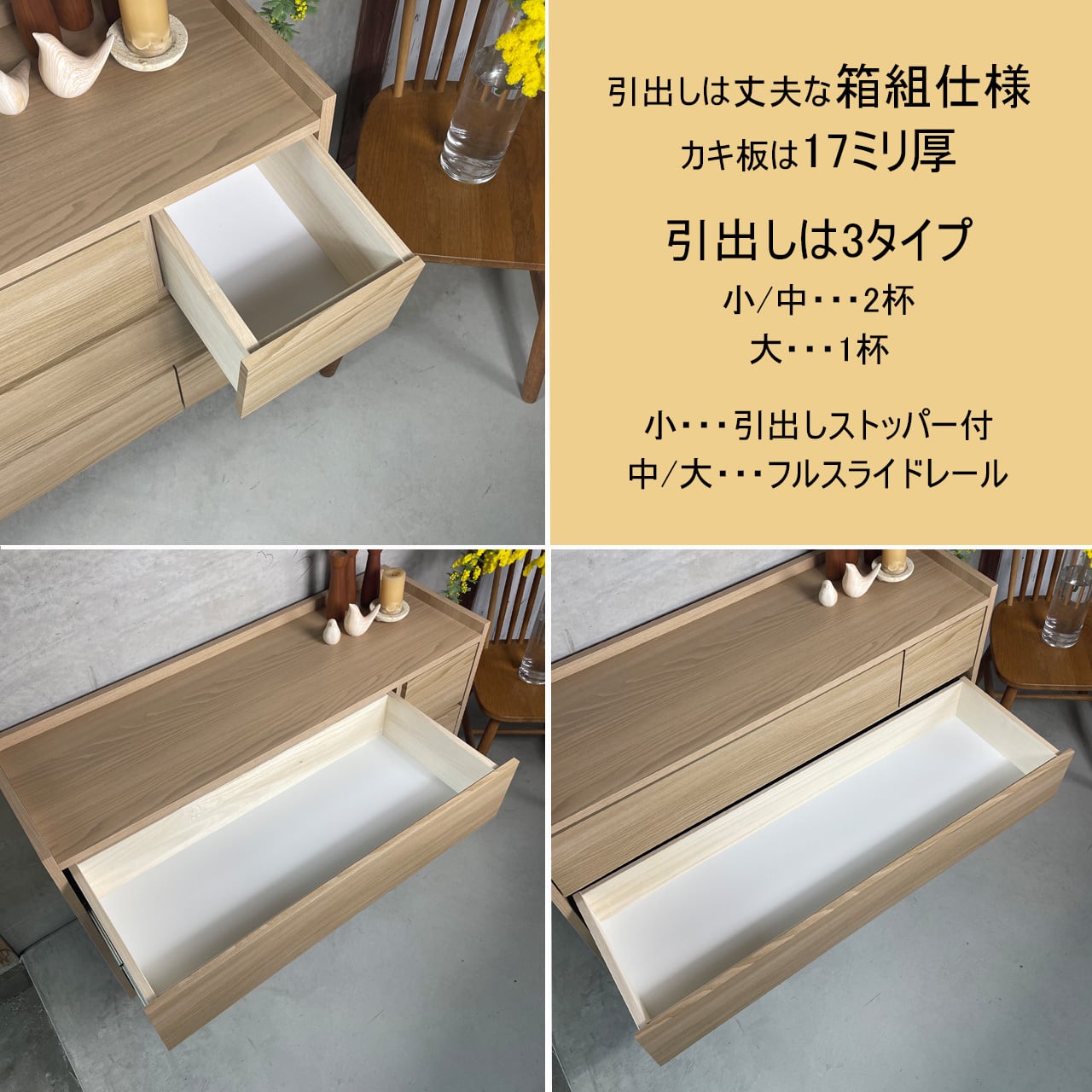 大・中引出にはフルスライドレールを使用。箱組(四方組)・桐材・ダボ組。カキ板17mm 大引出は底板補強サン付きで丈夫な作りです。